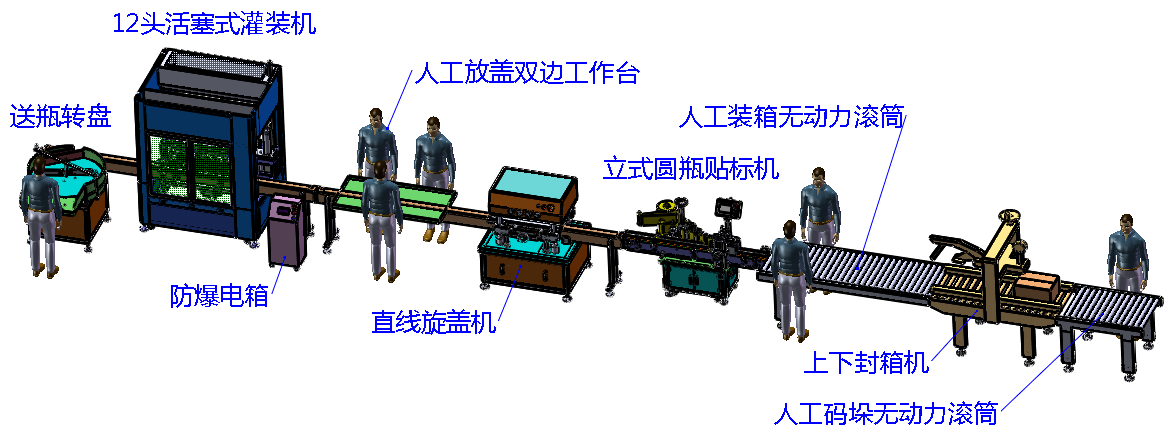 人工放瓶到送瓶轉(zhuǎn)盤→12頭活塞式灌裝→人工放蓋→自動(dòng)旋蓋→自動(dòng)貼標(biāo)→人工裝箱→半自動(dòng)封箱→人工碼垛