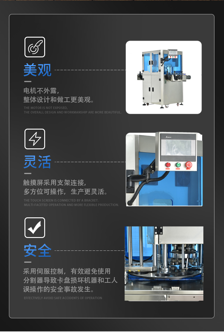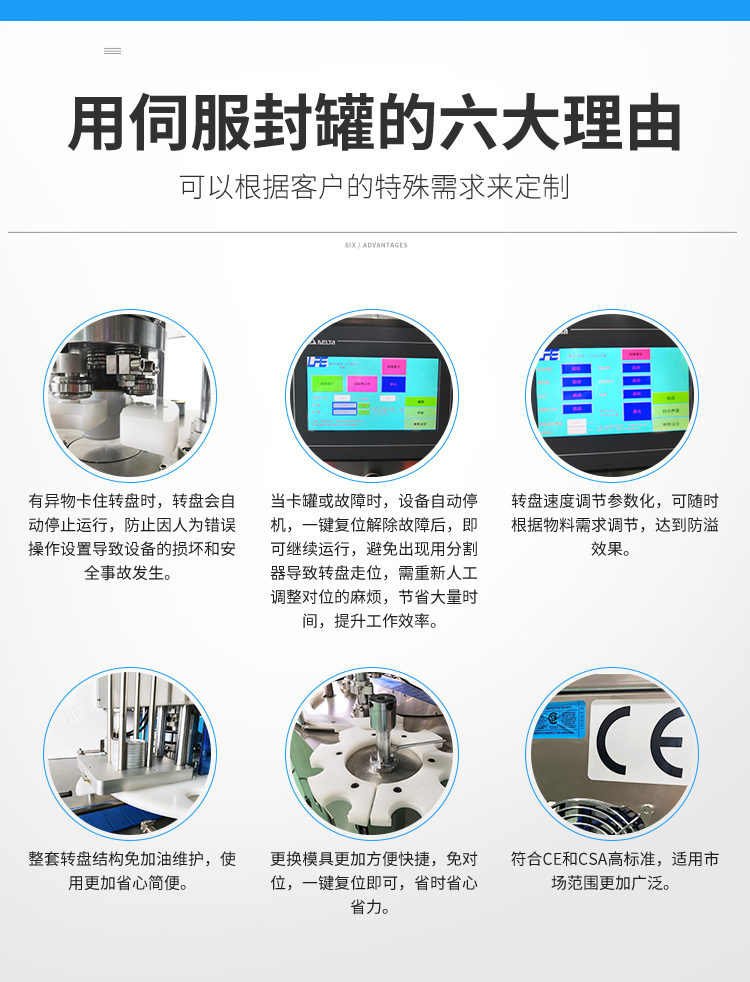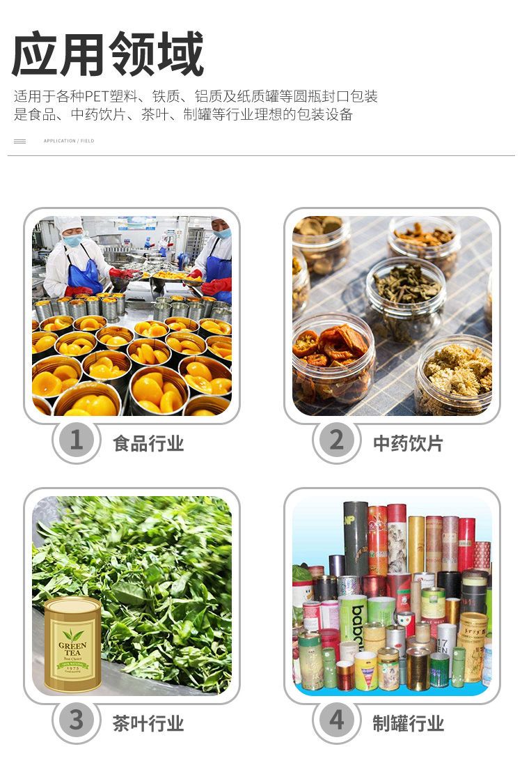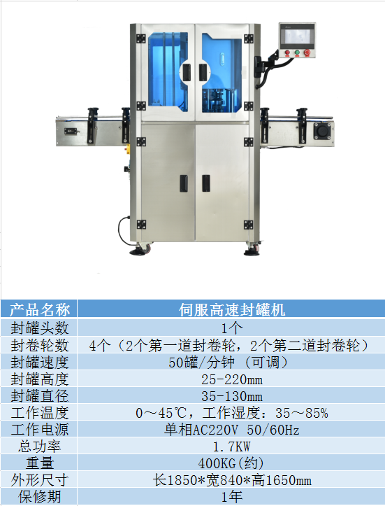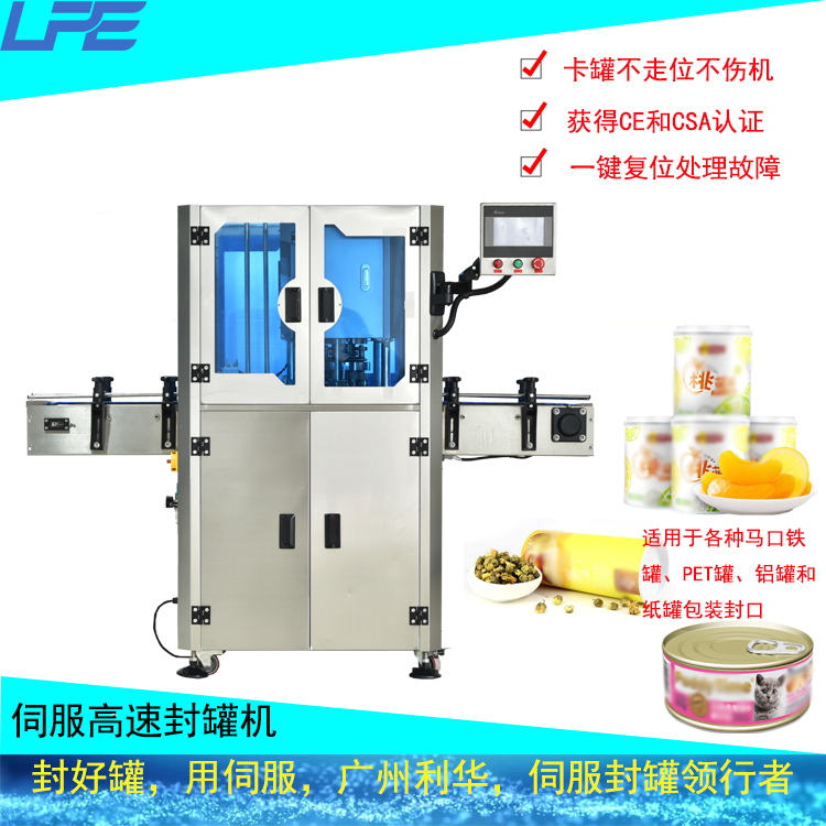 整機伺服控制,讓設備運行更加安全,穩定和智能。有罐才啟動轉盤;轉盤速度可單獨調節;當出現卡罐時,轉盤會自動停機,一鍵復位后即可解除故障再次運行;有異物卡住轉盤時,轉盤會自動停止運行,防止因人為錯誤操作設備而造成設備的損壞和安全事故的發生。適用于馬口鐵罐,鋁罐,塑料罐和鐵罐包裝的產品封罐,是食品,飲料,中藥飲品,化工等行業的理想包裝設備。