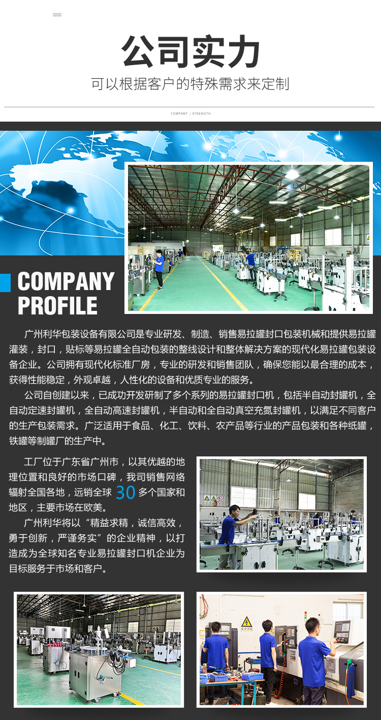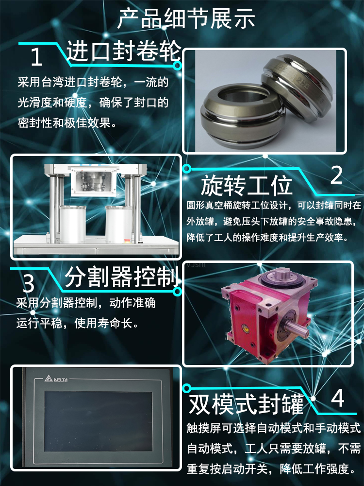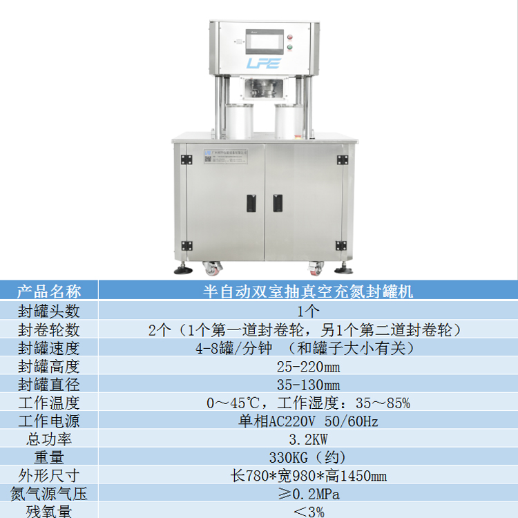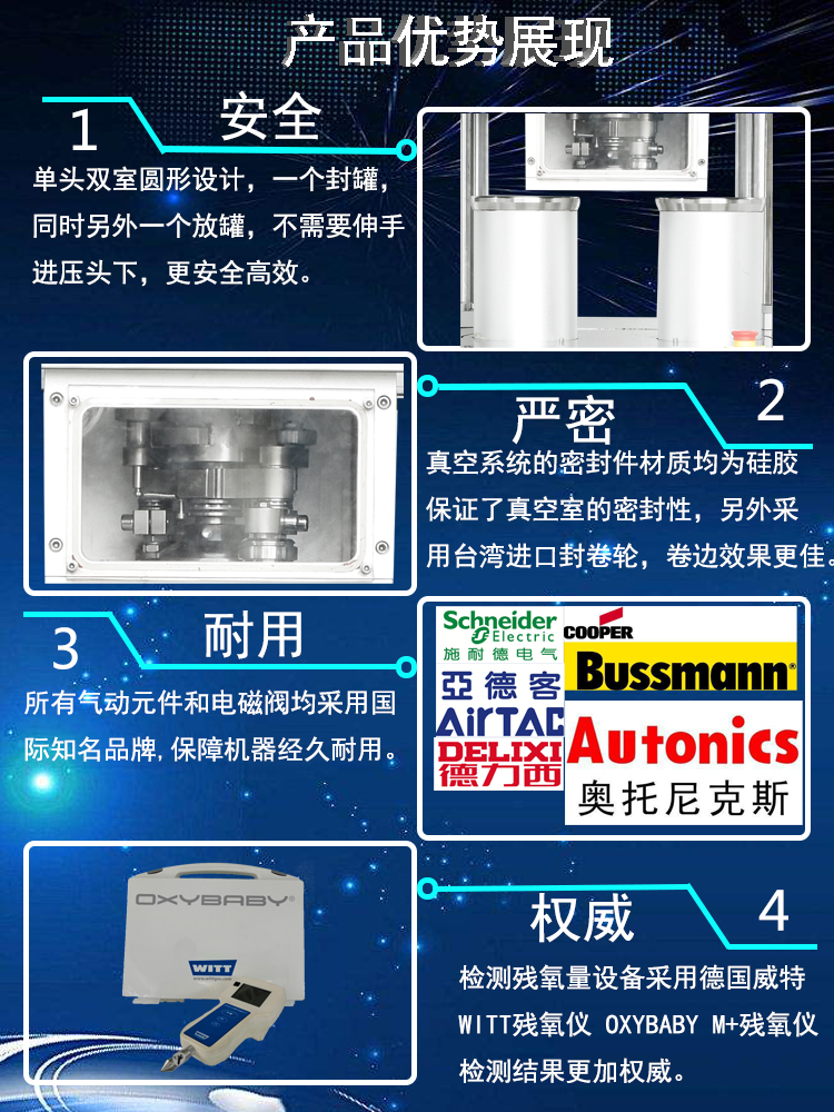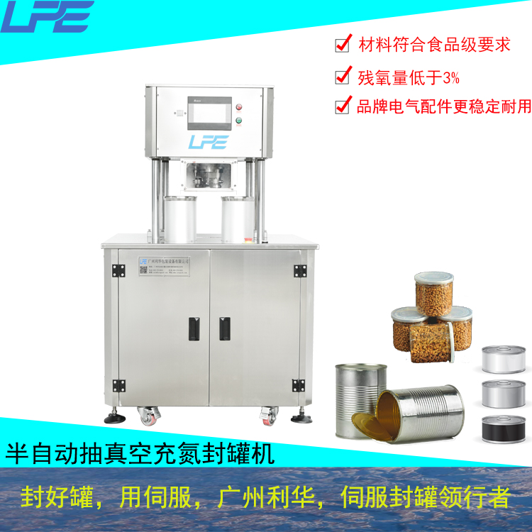 適用于各種圓形開口的馬口鐵罐,鋁罐,紙罐和塑料罐包裝的產品先抽真空,然后充氮氣,最后封口.
